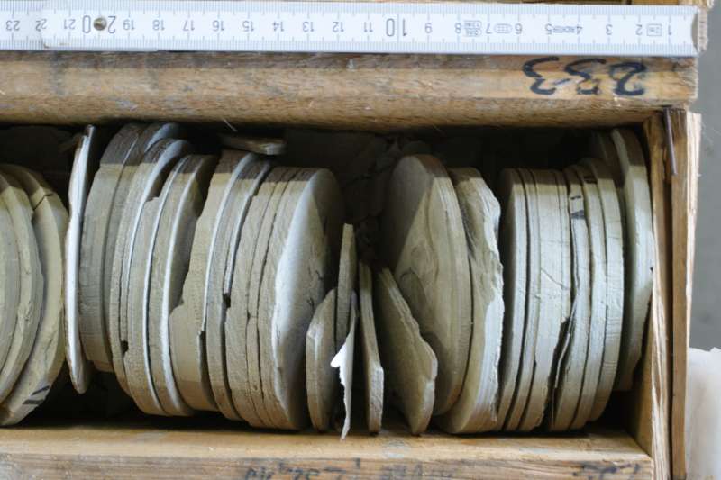 Beispiel für einen Seesediment-Bohrkern der Forschungsbohrung Nördlingen 1973 (Teufe 233 Meter).