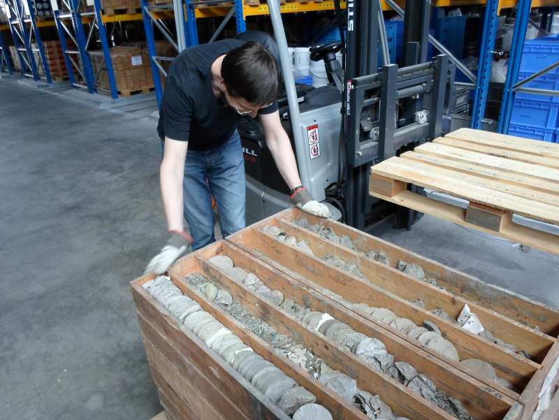 Palette mit Bohrkernen der insgesamt 1200 Meter langen Forschungsbohrung Nördlingen 1973 im Bohrkernlager des Bayerischen Landesamtes für Umwelt in Hof/Saale.