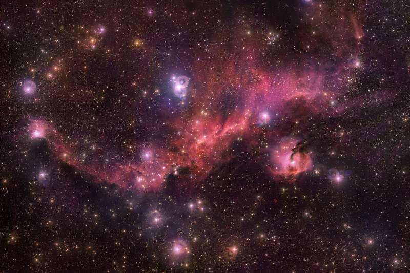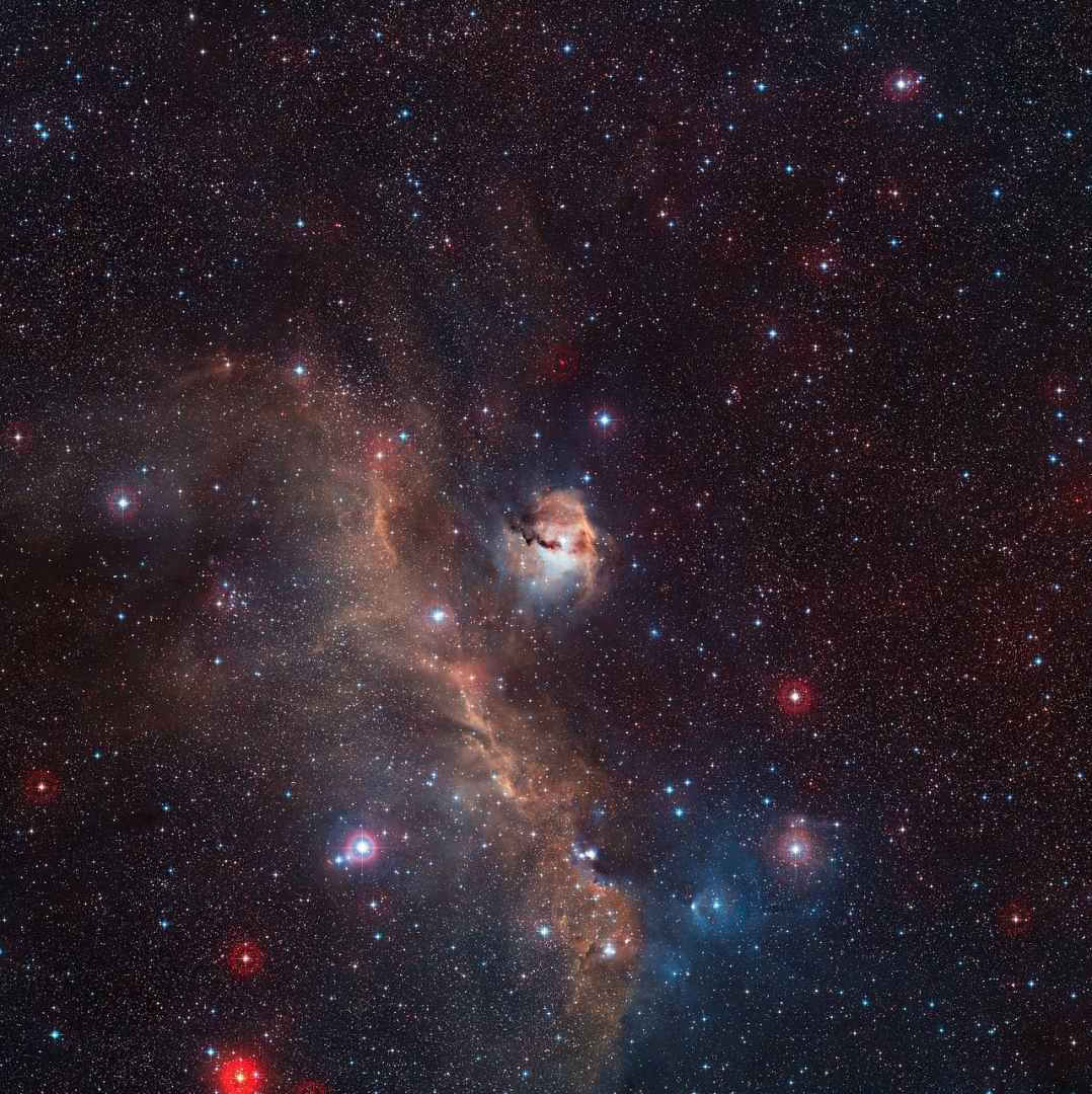 Diese farbenfrohe und faszinierende Ansammlung von Objekten ist bekannt als der Möwennebel, benannt nach seiner Ähnlichkeit mit einer Möwe im Flug. Diese Region, die aus Staub, Wasserstoff, Helium und Spuren von schwereren Elementen besteht, ist die heiße und energiegeladene Geburtsstätte neuer Sterne. Das bemerkenswerte Detail, das hier vom VLT Survey Telescope (VST) der ESO aufgenommen wurde, enthüllt die einzelnen astronomischen Objekte, aus denen der Sternenvogel besteht, sowie die feineren Strukturen. Das VST ist derzeit das größte Durchmusterungsteleskop der Welt, das den Himmel im sichtbaren Licht beobachtet.