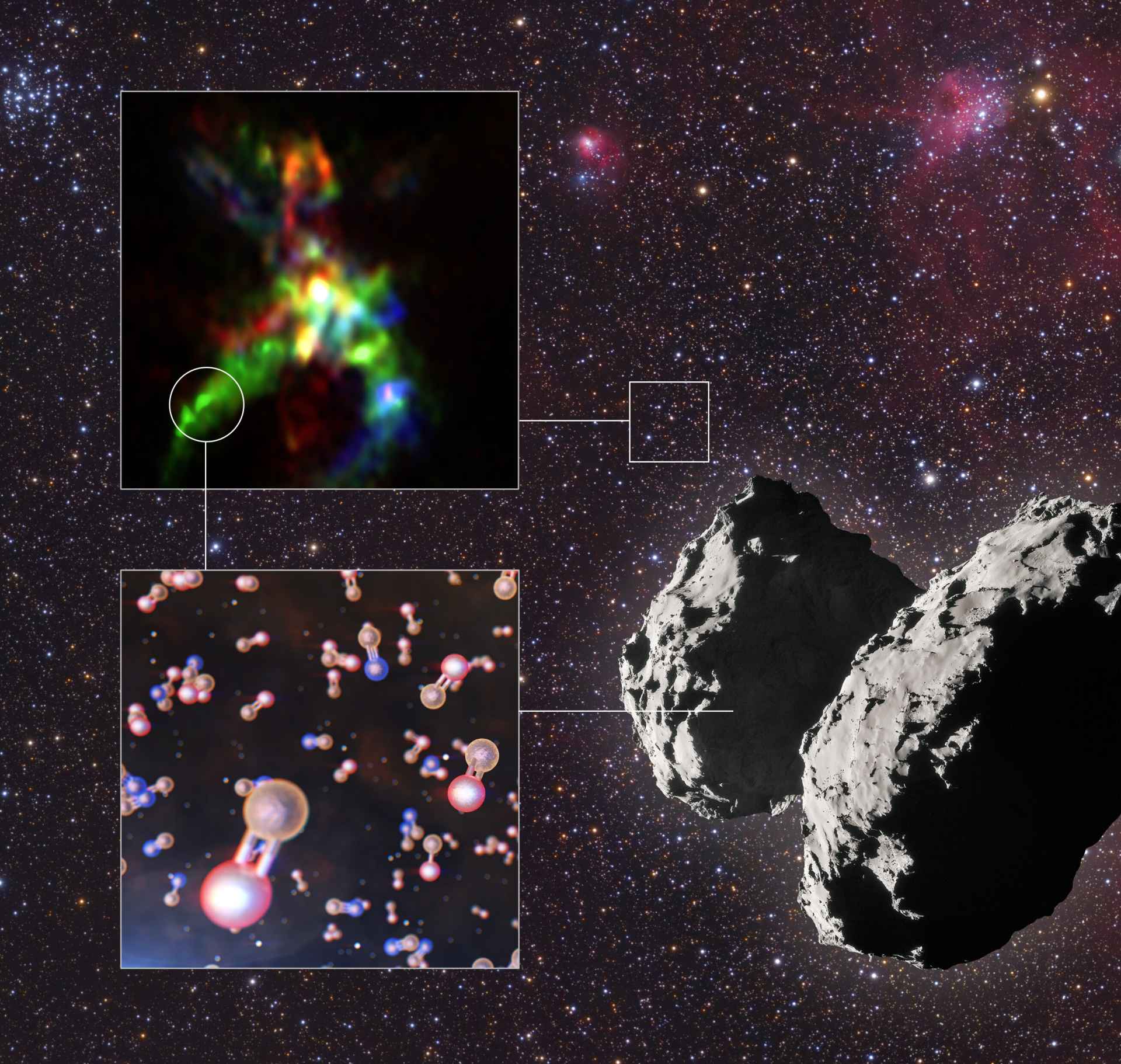 Im Anschluss an die Suche nach diesem Molekül in Sternentstehungsgebieten mit ALMA begab sich das europäische Team zu einem Objekt im Sonnensystem: dem inzwischen berühmten Kometen 67P/Churyumov-Gerasimenko. Die Idee war, den Spuren dieser phosphorhaltigen Verbindungen zu folgen. Wenn die Hohlraumwände zu einem Stern zusammenfallen, insbesondere zu einem weniger massereichen wie der Sonne, kann Phosphormonoxid ausfrieren und in den eisigen Staubkörnern, die um den neuen Stern herum verbleiben, eingeschlossen werden. Noch bevor der Stern vollständig gebildet ist, kommen diese Staubkörner zusammen und bilden Kieselsteine, Felsen und schließlich Kometen, die zu Transportern von Phosphormonoxid werden.