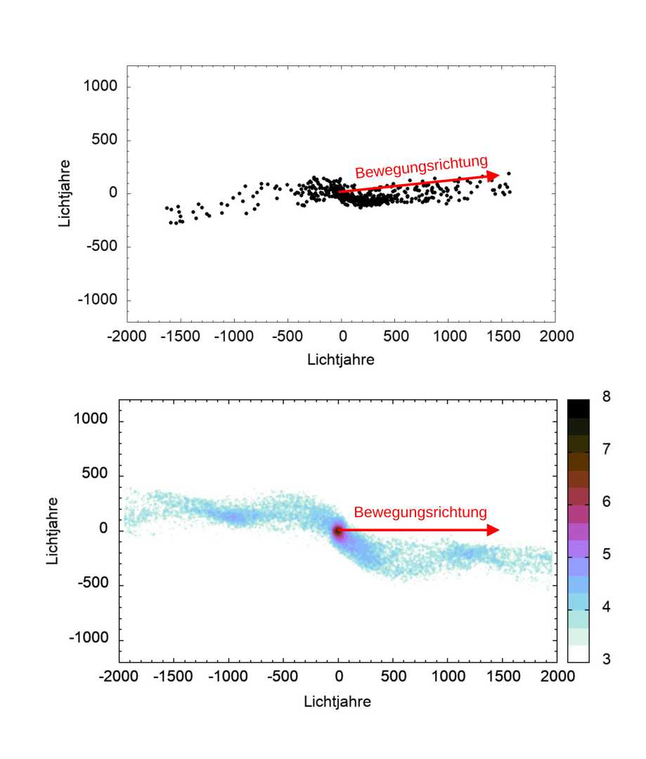 „Nach den Newtonschen Gravitationsgesetzen unterliegt es dem Zufall, in welchem der Arme ein verlorener Stern landet“, erklärt Dr. Jan Pflamm-Altenburg vom Helmholtz-Institut für Strahlen- und Kernphysik. „Beide Arme müssten also ungefähr dieselbe Zahl von Sternen enthalten. Wir konnten in unserer Arbeit aber erstmals nachweisen, dass das nicht stimmt: In den Haufen, die wir untersucht haben, enthält der vordere Arm stets deutlich mehr Sterne als der hintere.“