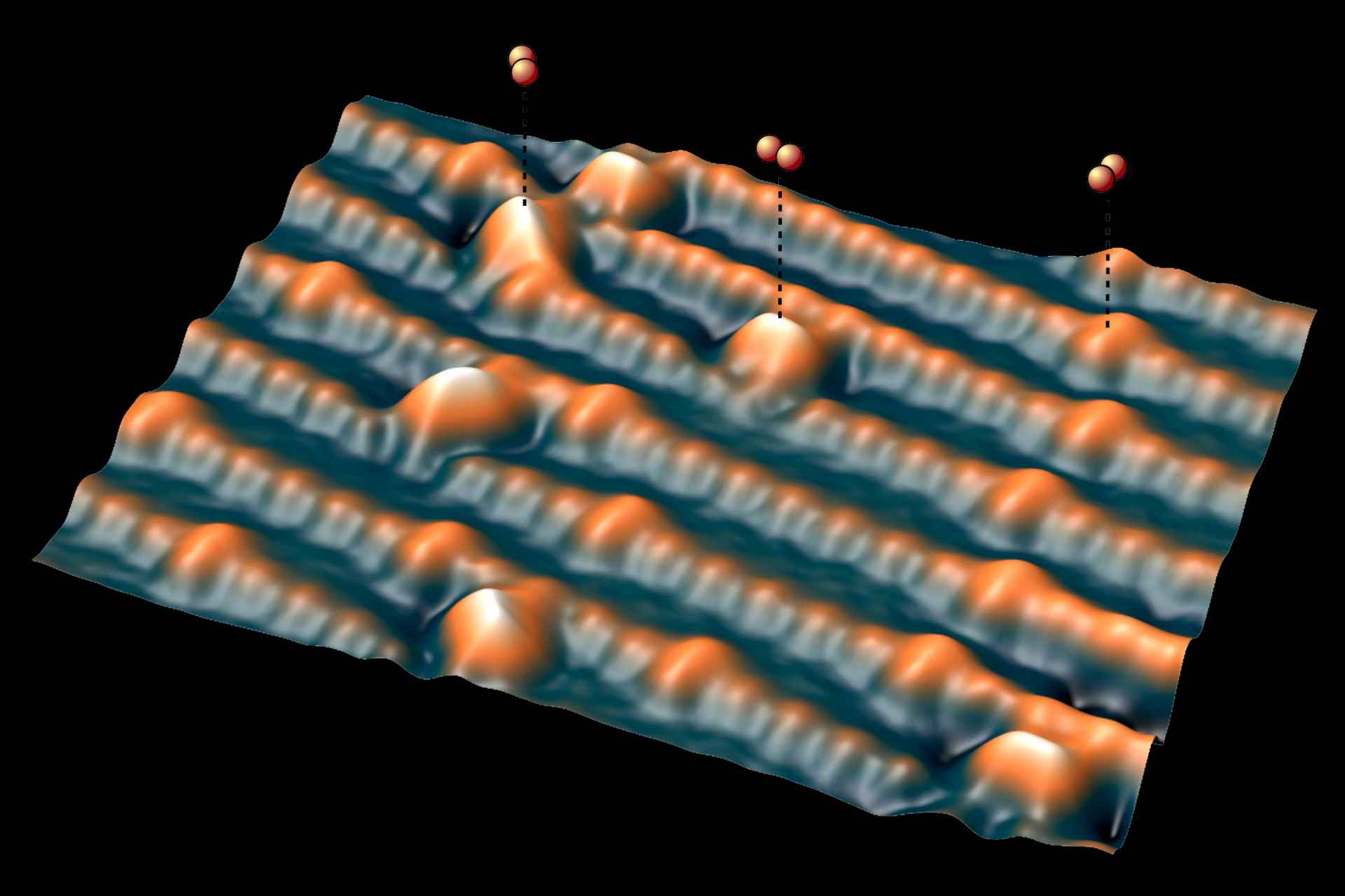 Leider ist es nicht einfach, ein Bild von diesen Atomen aufzunehmen. Oft werden Rastertunnelmikroskope eingesetzt, um Oberflächen Atom für Atom abzubilden. Dabei führt man eine feine Spitze in minimalem Abstand über die Probe, sodass einzelne Elektronen zwischen Probe und Spitze überwechseln können. Gemessen wird der elektrische Strom, der dabei fließt. Diese Methode lässt sich in diesem Fall allerdings nicht einsetzen – die Sauerstoffmoleküle würden elektrisch aufgeladen werden und dadurch ihr Verhalten völlig verändern.