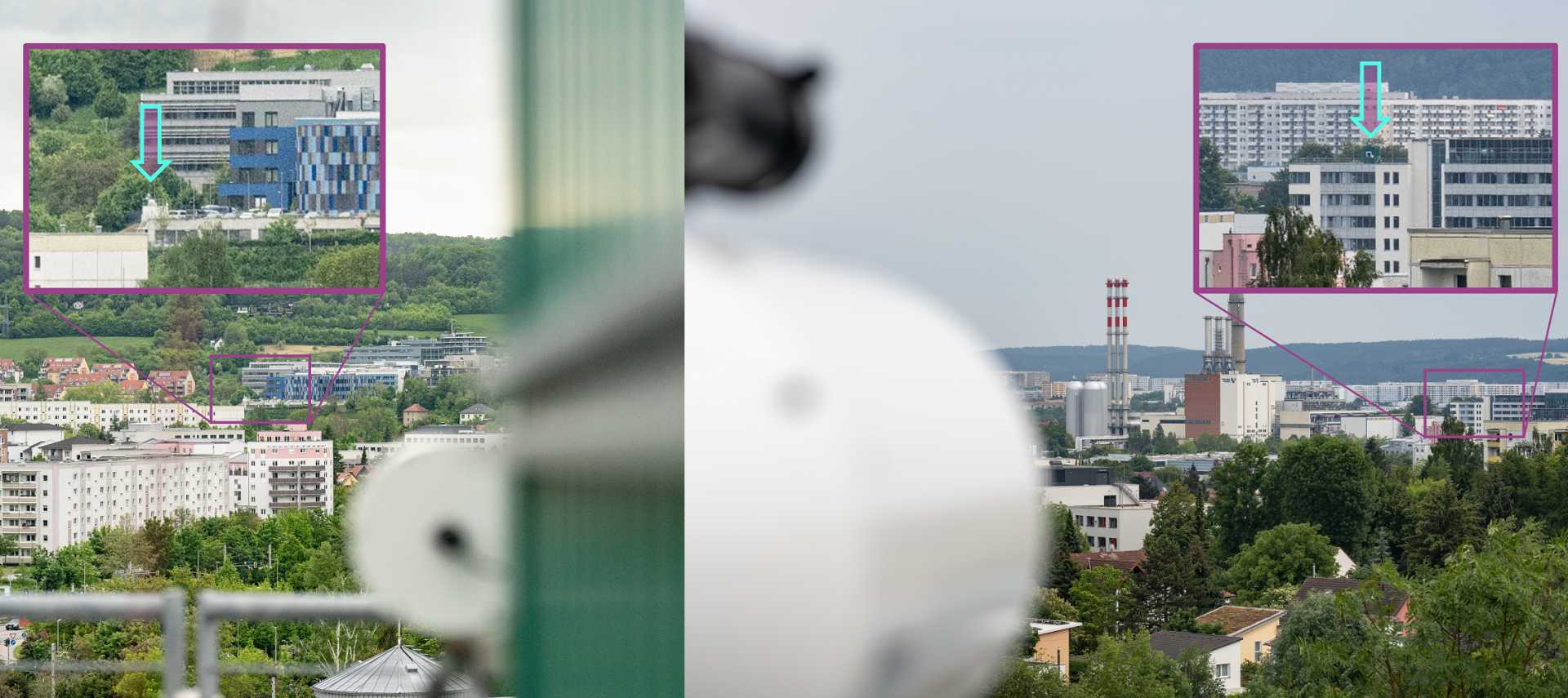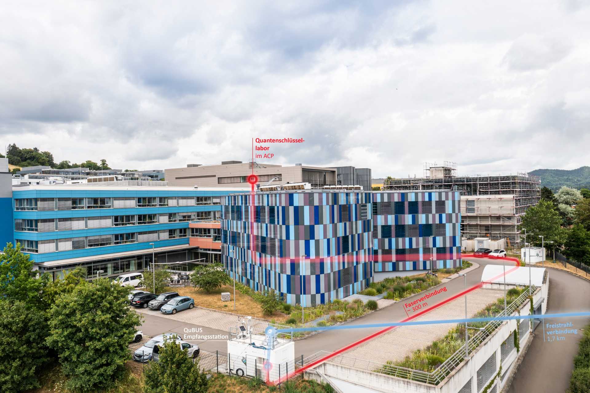 Im konkreten Fall haben die Forschenden eine quantengesicherte Verbindung auf einer knapp zwei Kilometer langen Teststrecke in Jena hergestellt. Auf dieser wurde der Quantenschlüsselaustausch in zwei Etappen umgesetzt: Los ging die Reise auf dem Dach der Stadtwerke Jena. Dort steht ein grüner Container, in dessen Bauch sich ein Teleskop zum Senden von Quantenschlüsseln befindet. Von hier fliegen Lichtteilchen, welche die Grundlage zur Generierung eines hochsicheren Quantenschlüssels bilden, zuerst über 1,7 Kilometer Luftlinie via Freistrahl hinüber zum Beutenberg Campus Jena. Dort werden sie auf dem Außengelände des Fraunhofer IOF von einer Empfangsstation in einem weiteren Container aufgefangen. Von diesem Zwischenknotenpunkt aus wird das Signal in eine Faserverbindung eingespeist und über 300 Meter Faser an ein dem Institut benachbartes Gebäude weitergeleitet. Dort wird aus den Messungen an den Lichtteilchen schlussendlich ein Quantenschlüssel erzeugt.