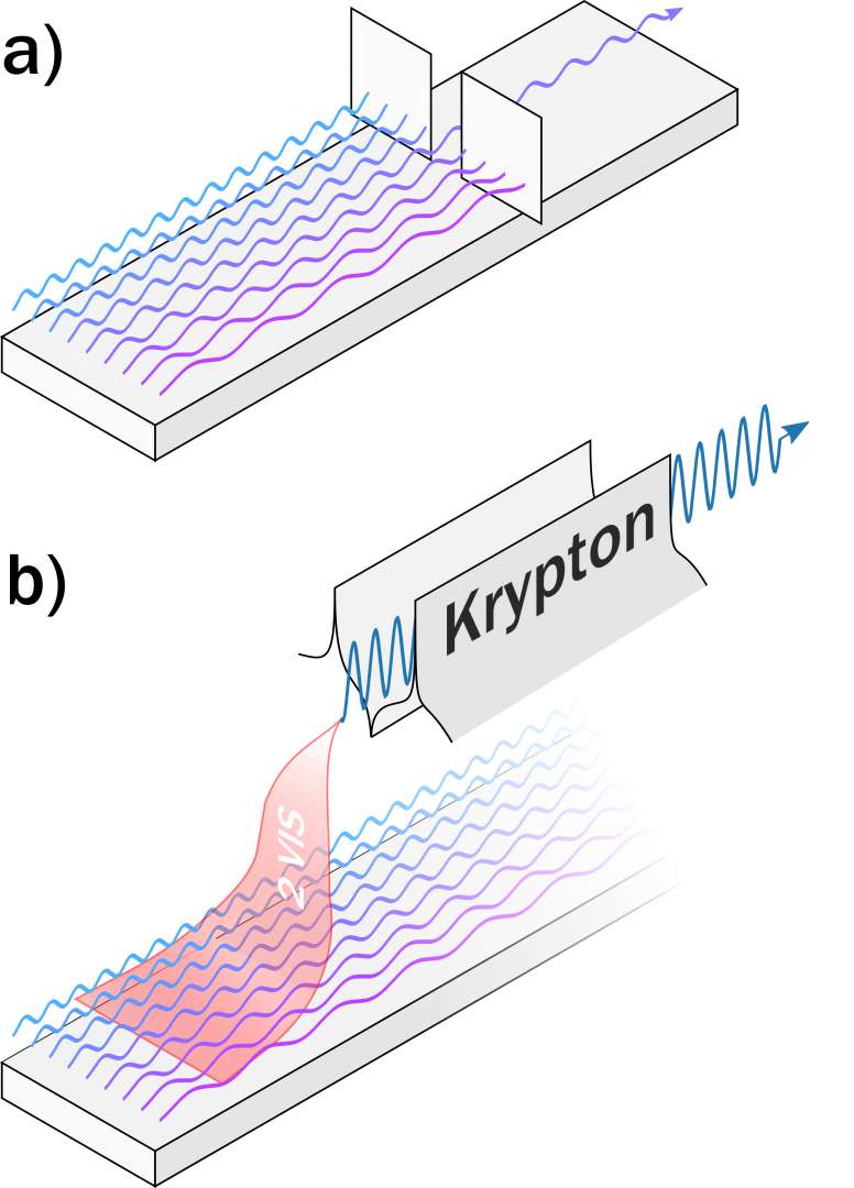 Ein Forscherteam vom Max-Born-Institut hat kürzlich ein neues Konzept demonstriert, um schmalbandige Laserpulse im XUV-Bereich zu erzeugen. Dabei haben sie breitbandiges weißes Licht im sichtbaren Bereich mit breitbandigem Licht im vakuum-ultravioletten (VUV) Bereich kombiniert. Nachdem diese beiden Lichtpulse gleichzeitig durch einen dichten Jet von Krypton-Atomen propagiert sind, wurde ein neuer Laserpuls im XUV-Bereich erzeugt. Bemerkenswerterweise war die spektrale Breite mehr als hundertfach schmaler verglichen mit der Breite der sichtbaren und VUV-Pulse.
