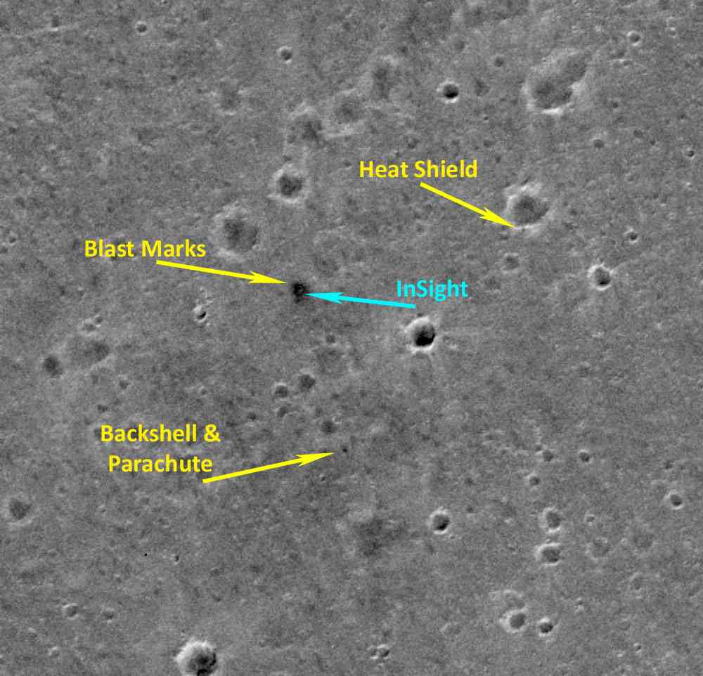 Das farbempfindliche Bild wurde am 2. März 2019 von CaSSIS aufgenommen und bildet eine Fläche von 2.25 x 2.25 km ab. Zu diesem Zeitpunkt hämmerte InSight eine Sonde in den Marsboden, um die Hitze im Inneren des Planeten zu messen. Auf der Aufnahme von CaSSIS ist InSight als etwas hellerer Fleck im Zentrum einer dunklen Fläche zu sehen, die entstanden ist, als der Lander seine Bremsraketen zündete kurz vor seiner Landung in der Elysium Planitia Region und Staub aufwirbelte. Ebenfalls zu sehen sind das kurz vor der Landung abgeworfene Hitzeschild am Rande eines Kraters und der Schutzschild von InSight.