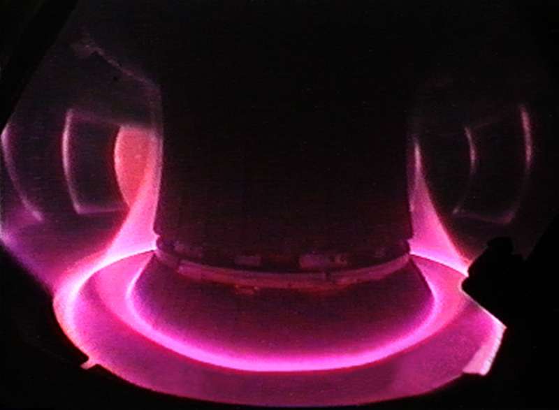 Blick in das Plasma von ASDEX Upgrade. Der Rand des Plasmas wird auf die robusten Divertor-Platten am Boden des Gefäßes gelenkt.