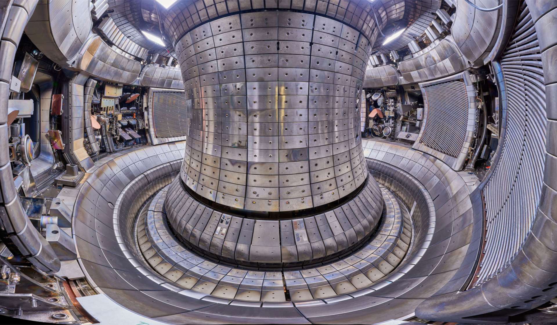 Das Plasmagefäß von ASDEX Upgrade. Am Boden sind die Prallplatten des Divertors zu sehen.