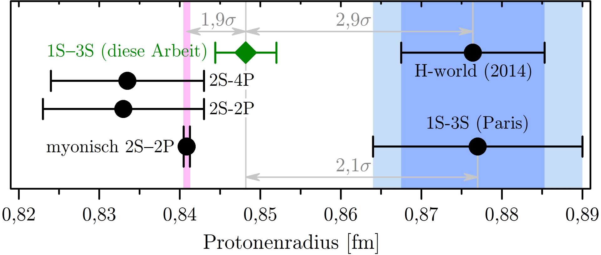 Die Abbildung stellt verschiedene Ergebnisse für den Protonenradius in Femtometer [fm], d.h. 10-15m, gegenüber. Der neue Wert aus dem 1S-3S Übergang im gewöhnlichen Wasserstoff liegt näher an dem Wert, der aus dem 2S-2P Übergang im myonischen Wasserstoff ermittelt wurde. Dieses exotische Atom lässt sich zwar nur für die kurze Zeit von zwei millionstel Sekunden erzeugen, ist jedoch besonders „empfindlich“ auf den Protonenradius. Daher hat es die kleinsten Messfehler (horizontale schwarze Fehlerbalken). Um etwas über die Gültigkeit der Quantenelektrodynamik aussagen zu können müssen mehrere unabhängige Messungen verglichen werden. Stimmt die Theorie und deren Anwendung, und sind die Experimente korrekt ausgeführt, so sollte sich stets derselbe Wert für den Protonenradius ergeben. Dies ist, wie man im Bild sieht, nicht der Fall. Mit dem Bekanntwerden dieses Problems ließ diese Diskrepanz – das Protonenrätsel – die Vermutung zu, mit der Quantenelektrodynamik, der genauesten physikalischen Theorie, könne es ein grundlegendes Problem geben. Das neue nun publizierte Ergebnis deutet wiederum an, dass das Problem von experimenteller und nicht fundamentaler Natur ist. Die Quantenelektrodynamik hätte damit ein weiteres Mal triumphiert.
