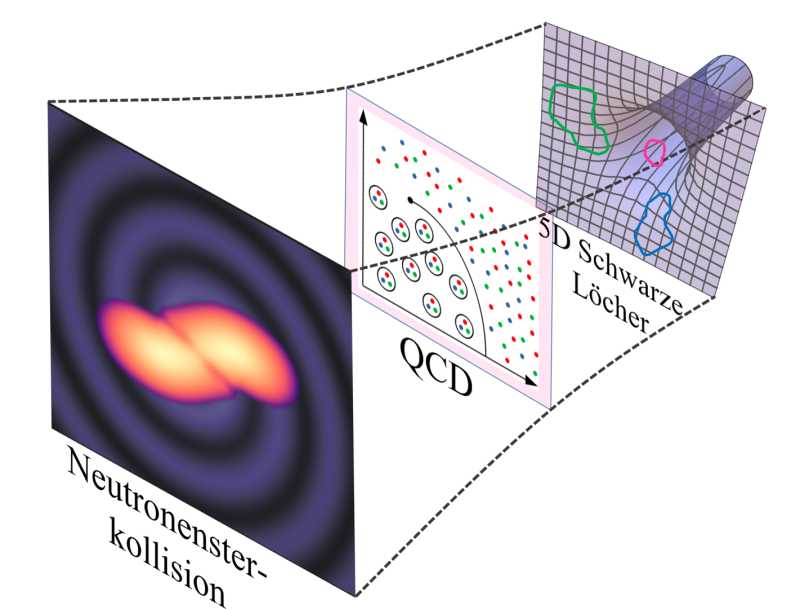 Darin erweitern sie Modelle aus der Kernphysik, die bei hohen Dichten ihre Aussagekraft verlieren, mit einer Methode aus der Stringtheorie, die den Übergang zu dichter und heißer Quarkmaterie beschreiben kann. “In unserer Methode verwenden wir einen mathematischen Zusammenhang aus der Stringtheorie, nämlich die Korrespondenz zwischen fünfdimensionalen schwarzen Löchern und stark wechselwirkender Materie, um den Phasenübergang zwischen dichter Kern- und Quarkmaterie zu beschreiben”, erklären Dr. Demircik und Dr. Järvinen.