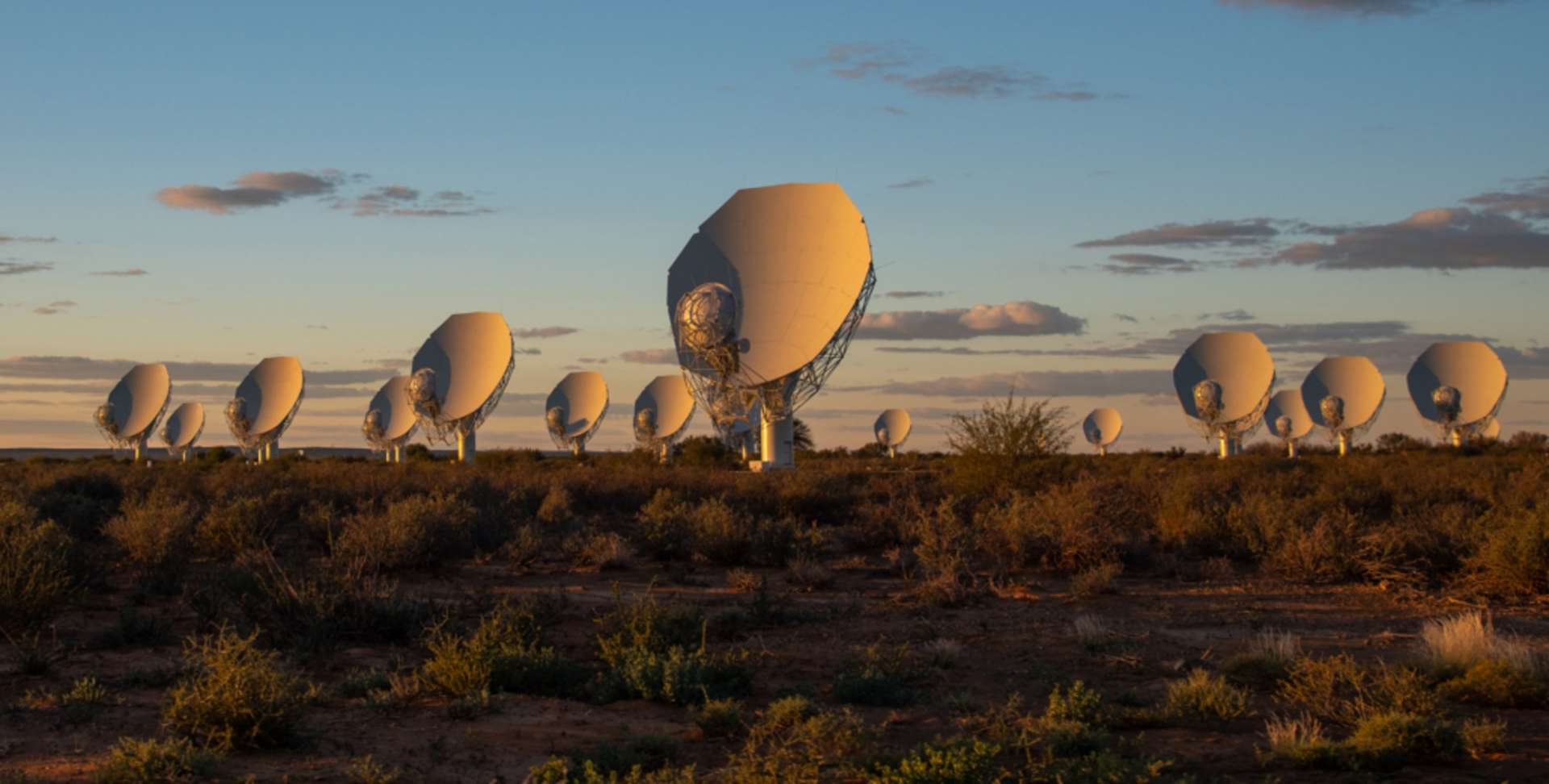 Vierzehn von insgesamt 64 Parabolspiegeln des MeerKAT-Radioteleskopnetzwerks in der Karoo-Halbwüste in Südafrika.