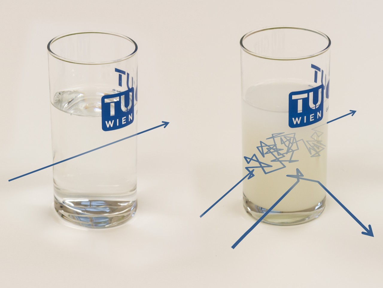„Ein vereinfachtes Bild von diesem Phänomen können wir uns machen, wenn wir uns das Licht als Strom kleiner Teilchen vorstellen“, sagt Stefan Rotter vom Institut für Theoretische Physik der TU Wien. „Die Bahnen der Lichtteilchen in der Flüssigkeit hängen natürlich davon ab, auf wie viele Hindernisse sie dort treffen.“