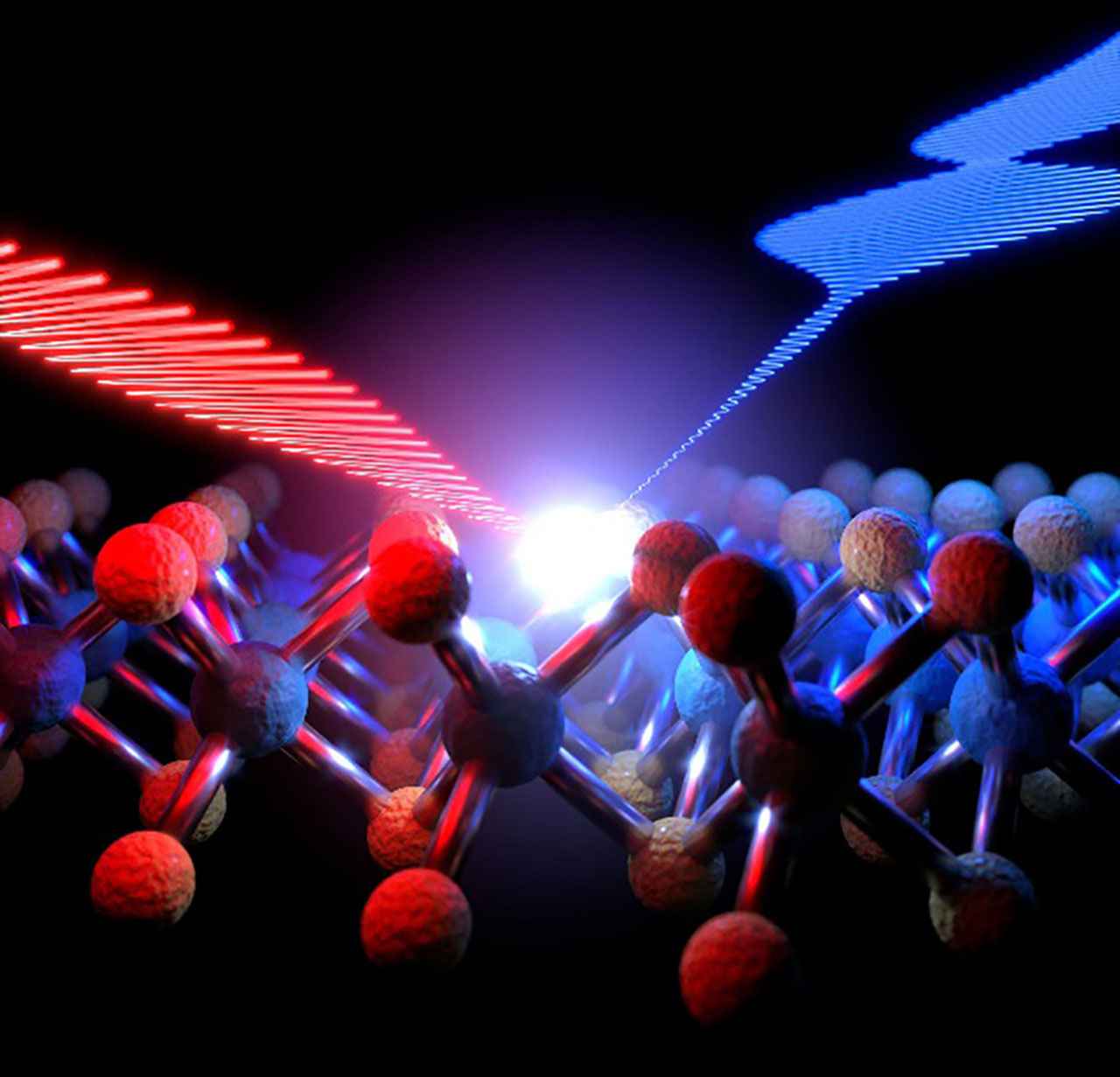 Wird eine solche Kristalllage nun mit Laserlicht bestrahlt, so können die von der Quantenphysik als Wellen beschriebenen Elektronen im Material entsprechend Energie aus dem Lichtfeld aufnehmen. Sie ändern dabei ihre Energie sprunghaft, ein Prozess, der mit einer Schwingung der Elektronenwelle verbunden ist. Finden sich im Material nun mindestens drei passende Elektronenenergien, so können sich die zugehörigen Schwingungen ähnlich wie Wasserwellen überlagern und gegenseitig verstärken oder auslöschen – die sogenannte Quanteninterferenz. Diese lässt sich im Experiment durch die auftretende gestreute Strahlung nachweisen. Hierfür wird das Farbspektrum der von der Oberfläche zurückgestreuten Strahlung durch das Auffächern, zum Beispiel mittels eines Prismas, auf fehlende Farbkomponenten untersucht – bei genau der doppelten Frequenz des eingestrahlten Lichts fehlt dann eine Farbe im Spektrum.
