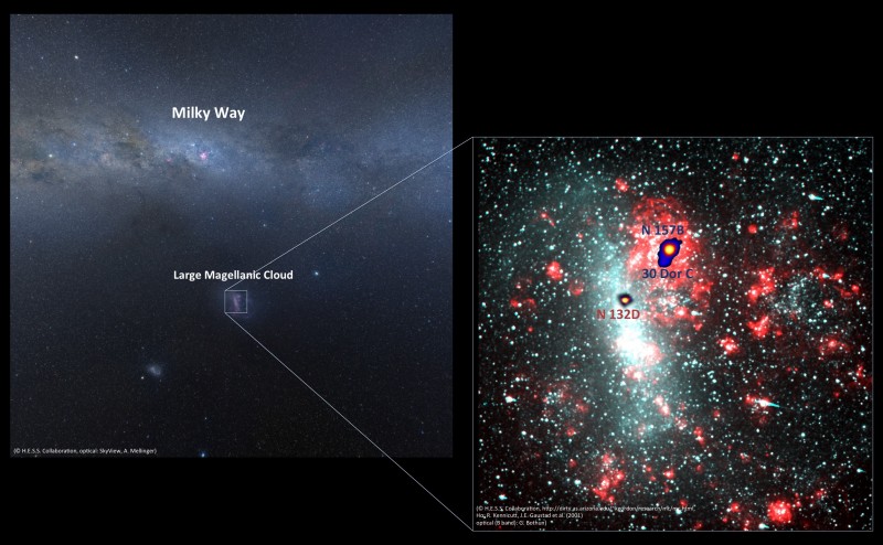 Die Große Magellansche Wolke (LMC) ist eine Zwerg-Satellitengalaxie unserer Milchstraße in einer Entfernung von ungefähr 170.000 Lichtjahren, die wir als Scheibe sehen. In ihr entstehen ständig neue massereiche Sterne, und sie beherbergt zahlreiche massereiche Sternhaufen. Die Rate, mit der neue massive Sterne gebildet werden und am Ende ihres Lebens als Supernovae explodieren, ist in der LMC im Verhältnis zu ihrer Sternmasse ist fünf Mal höher als in der Milchstraße. Der jüngste Supernova-Überrest in unserer lokalen Galaxiengruppe, SN 1987A, befindet sich ebenfalls in der LMC. Nicht zuletzt deshalb beobachten die Wissenschaftler der H.E.S.S.-Kollaboration dieses kosmische Objekt ausgiebig, auf der Suche nach höchstenergetischer Gammastrahlung, über die man den Aufbau der Teilchenbeschleunigung in der jungen Sternexplosion zu verstehen hofft.