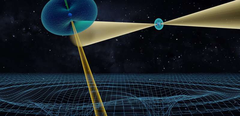 Prof. Ingrid Stairs von der University of British Columbia in Vancouver nennt ein Beispiel: "Wir verfolgen die Ausbreitung von Radiophotonen, die von einem kosmischen Leuchtturm, einem Pulsar, ausgesandt werden, und untersuchen ihre Bewegung im starken Gravitationsfeld eines Begleitpulsars. Wir sehen zum ersten Mal, dass das Licht nicht nur aufgrund einer starken Krümmung der Raumzeit um den Begleiter verzögert wird, sondern dass das Licht auch um einen kleinen Winkel von 0,04 Grad abgelenkt wird, den wir nachweisen können. Nie zuvor wurde ein solches Experiment bei einer so starken Raumzeitkrümmung durchgeführt."