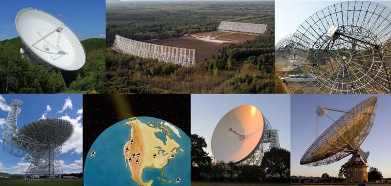 © N. Junkes (100-m), Letourneur (NRT), ASTRON (WSRT), CSIRO (Parkes), A. Holloway (JBO), NRAO/AUI/NSF (VLBA), NSF/AUI/GBO (GBT).