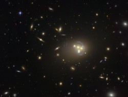 Mit dem Very Large Telescope der ESO (VLT) und dem NASA/ESA Hubble Space Telescope gemachte Beobachtungen kollidierender Galaxien haben nun die ersten faszinierenden Hinweise über die Natur dieser geheimnisvollen Komponente des Universums geliefert. Ein Team von Astronomen hat mit dem MUSE-Instrument am VLT der ESO in Chile zusammen mit Hubble-Bildern aus dem Erdorbit die gleichzeitige Kollision von vier Galaxien im Galaxienhaufen Abell 3927 untersucht. So konnten die Wissenschaftler die Lage der Masse innerhalb des Systems bestimmen und die Verteilung der Dunklen Materie mit den Positionen der hell leuchtenden Galaxien vergleichen.