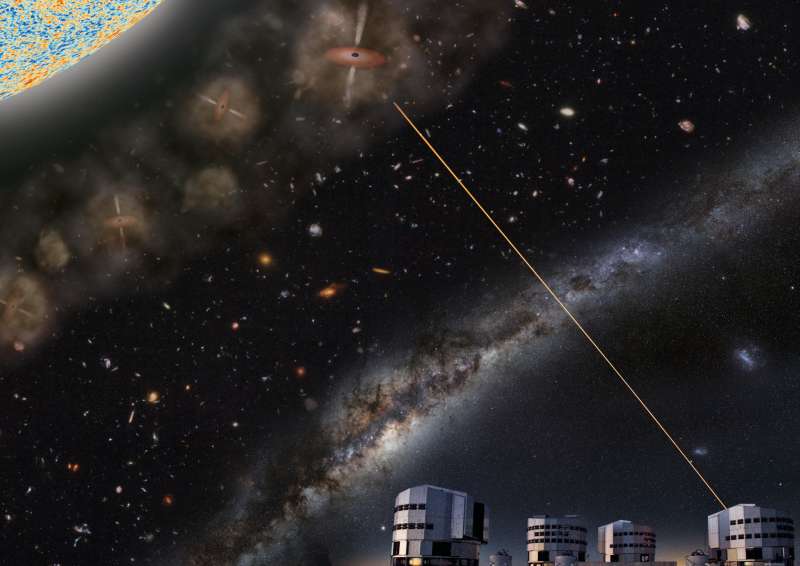 Künstlerische Darstellung der Beobachtung von weit entfernten Quasaren im jungen Universum.