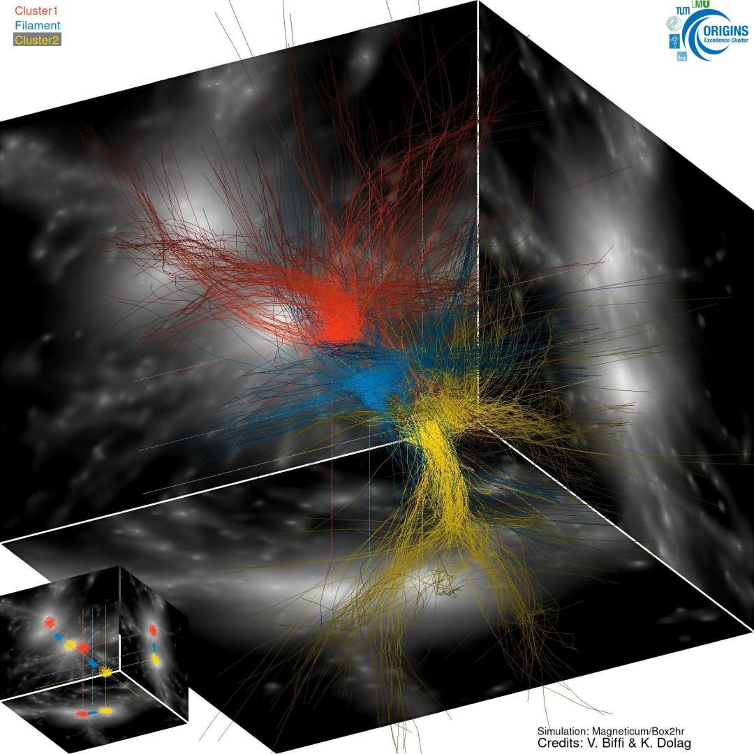 „Die neuen eROSITA-Bilder des beobachteten Systems ähneln bemerkenswert den Ergebnissen unserer kosmologischen Simulationen“, erklärt PD Dr. Dolag. In den an der Universität Sternwarte in München entwickelten Magneticum Simulationen fanden Dr. Biffi und PD Dr. Dolag ein sehr ähnliches Paar von Galaxienhaufen, die durch warmes Gas in einem brückenartigen Filament verbunden sind und mit vielen anderen umgebenden Objekten in eine viel größere Filamentstruktur eingebettet sind. Die Computersimulationen bestätigen dabei, dass solch lange Filamente, die sich über große Bereiche des Raumes erstrecken, eine erhebliche Menge an verdünntem Gas enthalten.