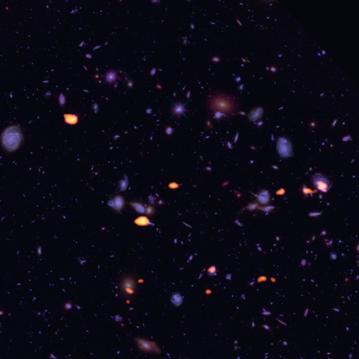Sternen-Rohmaterial in fernen Galaxien: Untersuchungen mit dem Teleskopverbund ALMA haben dokumentiert, welches Rohmaterial seit der Frühzeit rund 2 Milliarden Jahre nach dem Urknall im Kosmos zur Verfügung stand. Die Beobachtungen unter der Leitung von Fabian Walter vom Max-Planck-Institut für Astronomie nahmen dazu das sogenannte Hubble Ultra Deep Field (HUDF) ins Visier, das erstmals 2003/2004 vom Weltraumteleskop Hubble bis ins Detail abgebildet wurde. Dies sind die ersten hochempfindlichen Beobachtungen des HUDF im Millimeterwellenbereich, die auch spektrale Informationen enthalten und die Galaxien zeigen können, deren Licht rund 11 Milliarden Jahre zu uns unterwegs war.
