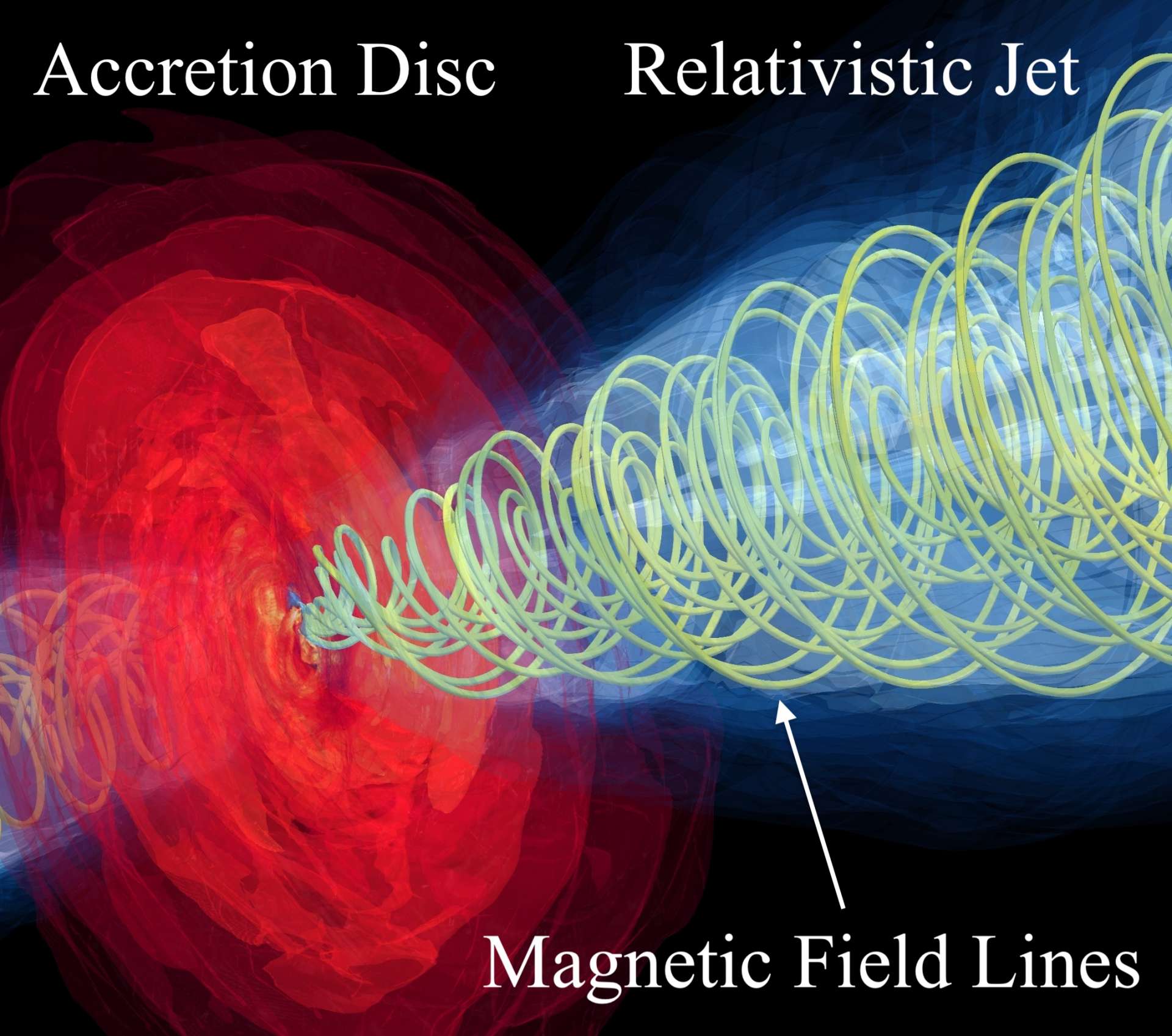 Dieses schwarze Loch (M87*) stößt mit nahezu Lichtgeschwindigkeit einen Plasmastrahl aus, einen so genannten relativistischen Jet, der 6000 Lichtjahre misst. Die ungeheure Energie für diesen Jet stammt wahrscheinlich aus der Anziehungskraft des schwarzen Lochs, doch wie genau ein solcher Jet entsteht und was ihn über diese riesige Entfernung hin stabilisiert, ist bisher noch nicht verstanden.
