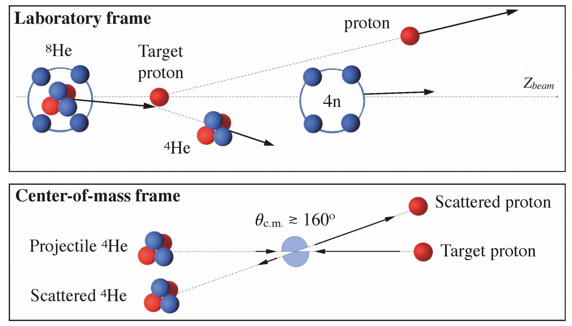 Die experimentelle Untersuchung von reinen Neutronen-Systemen stellt eine große Herausforderung dar, da es keine Möglichkeit gibt ein Neutronen-Target herzustellen. Um nun ein Multi-Neutronen-System in einem Volumen zu erzeugen, so dass die Neutronen untereinander über die kurzreichweitige Kernkraft (wenige Femtometer, 10-15 Meter) in Wechselwirkung treten können, müssen Reaktionen eingesetzt werden. Dabei besteht die Gefahr, dass die Neutronen mit anderen Teilchen, die an der Reaktion beteiligt sind, im Endzustand wechselwirken, was wiederum das eigentliche Signal verändert oder unsichtbar macht. Die Forschenden haben diese Schwierigkeit durch den Einsatz eines hochenergetischen ⁸He-Strahls gelöst. Der 8He-Kern besteht aus einem kompakten Alpha-Teilchen, das von vier Neutronen umgeben wird. Das Alpha-Teilchen wird nun in einer schnellen Reaktion mit großem Impulsübertrag durch Stoß mit einem Proton des Flüssigwasserstoff-Targets aus dem 8He-Kern herausgeschossen: Die verbleibenden vier Neutronen sind plötzlich frei und alleine und können untereinander wechselwirken.