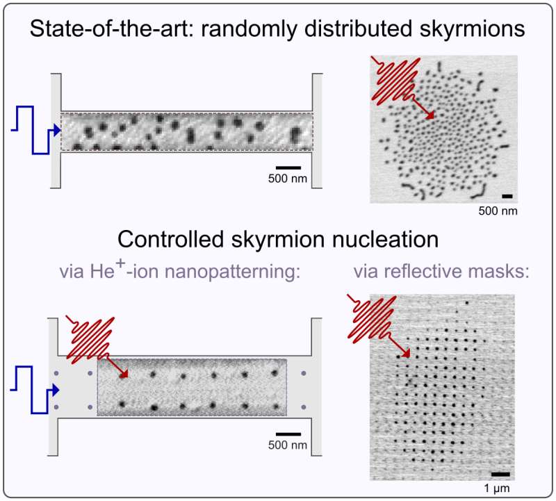 Eine erste Methode beruht auf der gezielten Bestrahlung einer dünnen magnetischen Schicht mit einem fokussierten Heliumionenstrahl, um flexibel Muster verschiedener Formen und Größen im magnetischen Material zu erzeugen. Wichtig ist, dass diese lokale Modifikation durch die sehr leichten Ionen nur die magnetischen Eigenschaften des Materials beeinflusst, während die Schicht strukturell intakt bleibt. Durch den Einsatz von Heliumionen ist es möglich, Positionen zu definieren, an denen Skyrmionen nukleieren, nachdem ihre Entstehung durch einen kurzen elektrischen Strom- oder Laserpuls ausgelöst wurde (siehe Abb. 1, wo Skyrmionen in zwei Reihen isolierter Punkte entstehen).