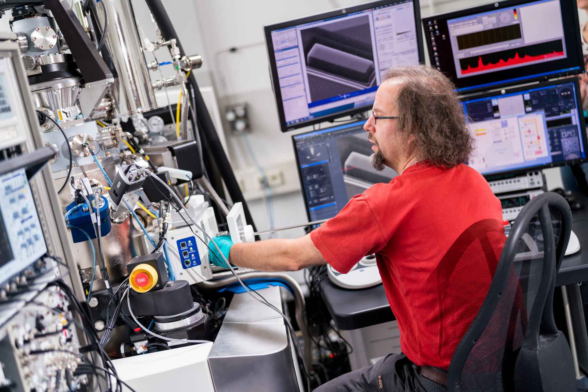 Kilian Lenz wiederum nutzt das Verfahren der fokussierten Ionenstrahl-Manipulation, um gewünschte Materialeigenschaften über Geometrieänderungen der Nanostruktur zu optimieren. Dabei hat der Neon-Ionenstrahl einen Durchmesser von gerade einmal zwei Nanometern. Dort, wo er auftrifft, werden Materialunebenheiten oder einfach nur Materialränder in gleicher Größenordnung abgetragen. „Wir untersuchen das anhand von Kohlenstoff-Nanoröhrchen, die über einen nahezu zylindrischen magnetischen Eisenkern verfügen und deren Struktur und Geometrie im Helium-Ionen-Mikroskop per Zuschnitt optimiert werden,“ beschreibt Lenz den Prozess.