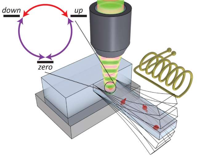 Die Wissenschaftler um Professor Patrick Maletinsky und den Doktoranden Arne Barfuss vom Swiss Nanoscience Institute an der Universität Basel berichten in „Nature Physics“ von einer neuen Methode, mit dem sich erstmals die Quantenzustände von Elektronenspins durch ein mechanisches System auf eine neuartige Weise kontrollieren lassen.