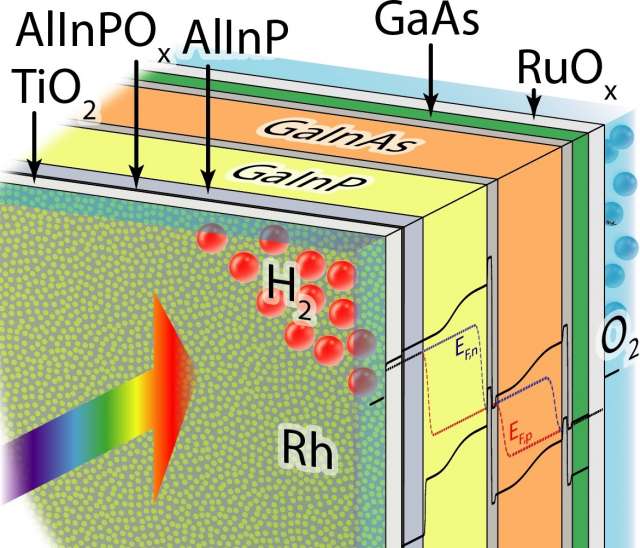 Für die hier untersuchte monolithische Photokathode haben die Forscher eine am Fraunhofer ISE entwickelte hocheffiziente Tandem-Zelle aus III-V-Halbleitern mit weiteren funktionalen Schichten kombiniert. Dabei gelang es ihnen, die Verluste durch Lichtreflexion und Absorption an der Oberfläche deutlich zu verringern. „Darin besteht auch die Innovation“, erläutert Prof. Hans-Joachim Lewerenz, Caltech, USA: „Denn bereits 2015 konnten wir in einer früheren Zelle einen Wirkungsgrad von über 14 Prozent erreichen, damals ein Weltrekord. Hier haben wir die Antikorrosionsschicht durch eine kristalline Titandioxid-Schicht ersetzt, die nicht nur hervorragende Antireflexionseigenschaften besitzt, sondern an der auch die Katalysator-Teilchen haften bleiben“. Und Prof. Harry Atwater, Caltech, fügt an: „Außerdem haben wir ein neues elektrochemisches Verfahren genutzt, um die Rhodium-Nanoteilchen herzustellen, die als Katalysatoren für die Wasserspaltung dienen. Sie messen nur 10 Nanometer im Durchmesser und sind damit optisch nahezu transparent, also ideal geeignet für ihre Aufgabe.“