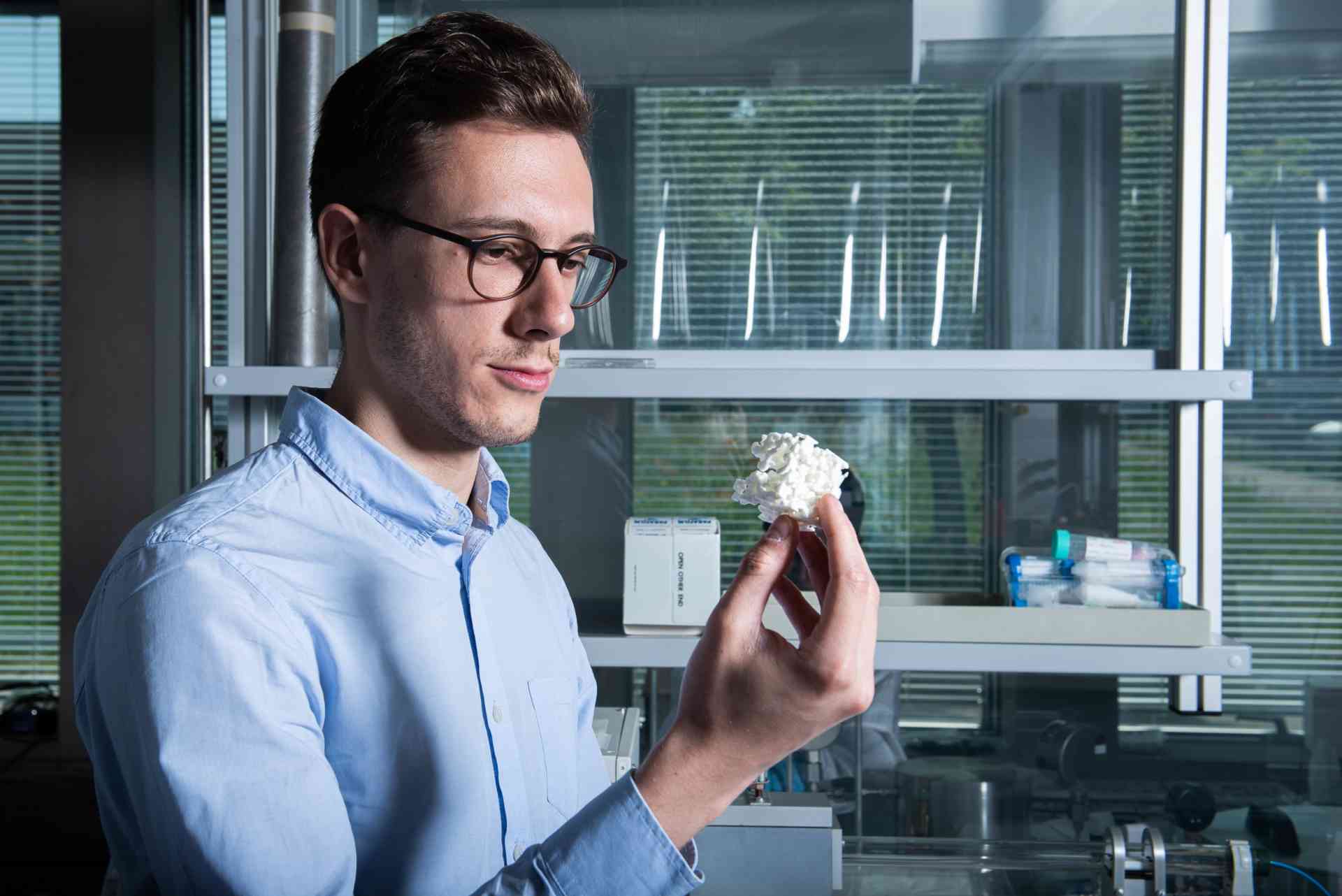Paolo Testa, Erstautor der Studie, mit einem Modell der prinzipiellen Struktur des formerinnernden Materials.