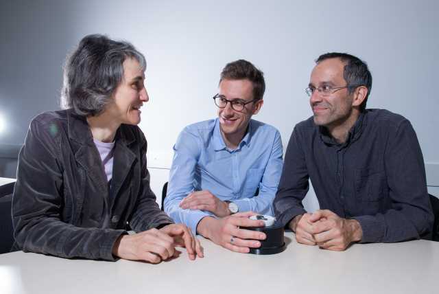 Laura Heyderman (links), Paolo Testa (Mitte) und Eric Dufresne mit einem Streifen des neuen Materials im Magnetfeld