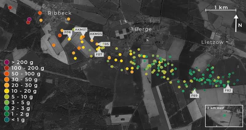 In ihrer Publikation beschreiben die Autoren, dass 202 Bruchstücke des Meteoriten mit einem Gesamtgewicht von 1,8 Kilogramm aufgefunden wurden. Das Streufeld umfasste eine Größe von 1,5 mal 10 Kilometer in der Nähe der Ortschaften Ribbeck, Berge und Lietzow. Dank der ungewöhnlich schnell erfolgreichen Suche konnte das Team nur wenige Tage nach dem Fall mit ihrer Untersuchung beginnen. Ohne es zu diesem Zeitpunkt zu wissen, standen die Sucher zunächst vor einer Herausforderung.