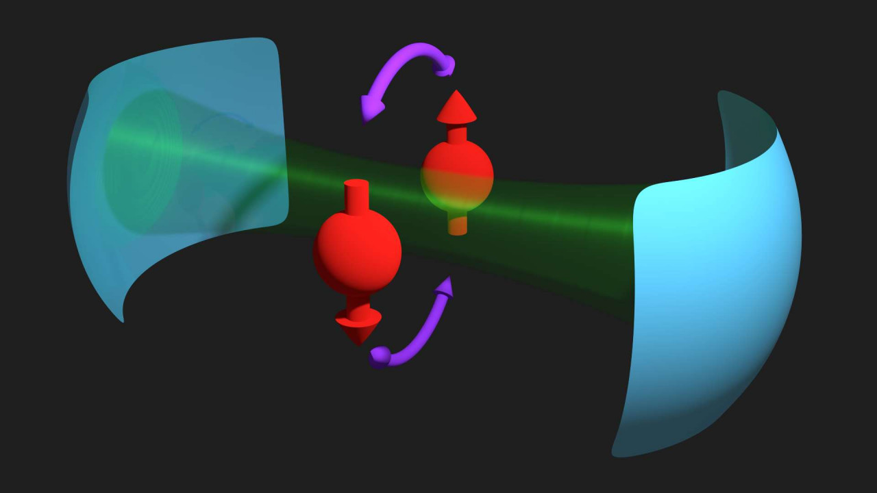 Bildunterschrift: Kopplung zwischen Elektronenspins (rot) und Licht (grün).