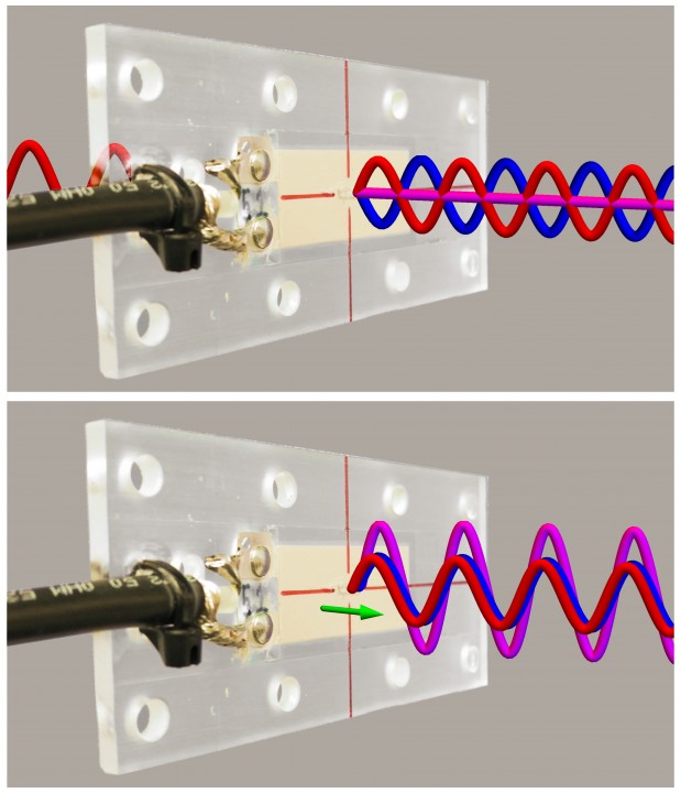 Die Wellen des durchgehenden und des wieder abgestrahlten Lichts überlagern sich wie die Wellen von zwei Steinen, die man nebeneinander ins Wasser geworfen hat. Wird nun die Folie in der Zeit zwischen Absorption und Emission ein Stückchen bewegt, ist das so, als ob einer der beiden Steine ein Stückchen weiter geflogen wäre. An einem festen Punkt beobachtet, erscheint dann im einen Fall vielleicht ein Wellental, im anderen Fall aber ein Wellenberg.