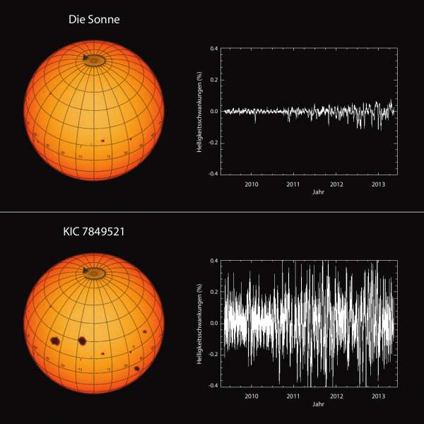 Die genaue Analyse der Helligkeitsschwankungen dieser Sterne in der Zeit von 2009 bis 2013 offenbart ein klares Bild. Während die Gesamtstrahlungsleistung der Sonne zwischen aktiven und inaktiven Phasen im Mittel um gerade einmal 0,07 Prozent schwankte, zeigten sich ihre stellaren Kollegen deutlich variationsreicher. Ihre Schwankungen sind typischerweise etwa fünfmal so stark. „Wir waren sehr überrascht, dass die meisten sonnenähnlichen Sterne so viel aktiver als die Sonne sind“, so Dr. Alexander Shapiro vom MPS, der dort die Forschergruppe „Verbindung Solarer und Stellarer Variabilität“ leitet.