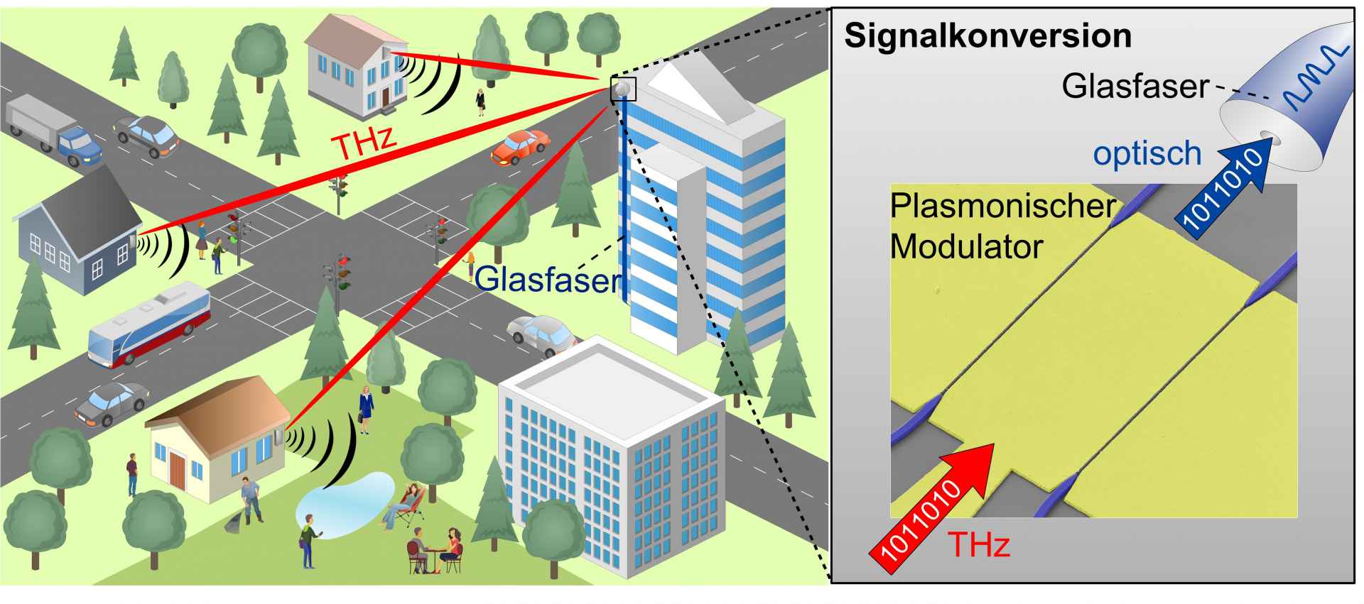 Einen vielversprechenden Ansatz zur Konversion der Datenströme von der Terahertz-Übertragung zur optischen Übertragung haben Wissenschaftler an den Instituten für Photonik und Quantenelektronik (IPQ), Mikrostrukturtechnik (IMT) sowie Hochfrequenztechnik und Elektronik (IHE) des KIT und dem Fraunhofer-Institut für Angewandte Festkörperphysik IAF in Freiburg entwickelt: Wie sie in der Zeitschrift Nature Photonics berichten, verwenden sie ultraschnelle elektro-optische Modulatoren, um ein Terahertz-Datensignal direkt in ein optisches Signal umzuwandeln und damit die Empfängerantenne direkt an eine Glasfaser anzukoppeln.