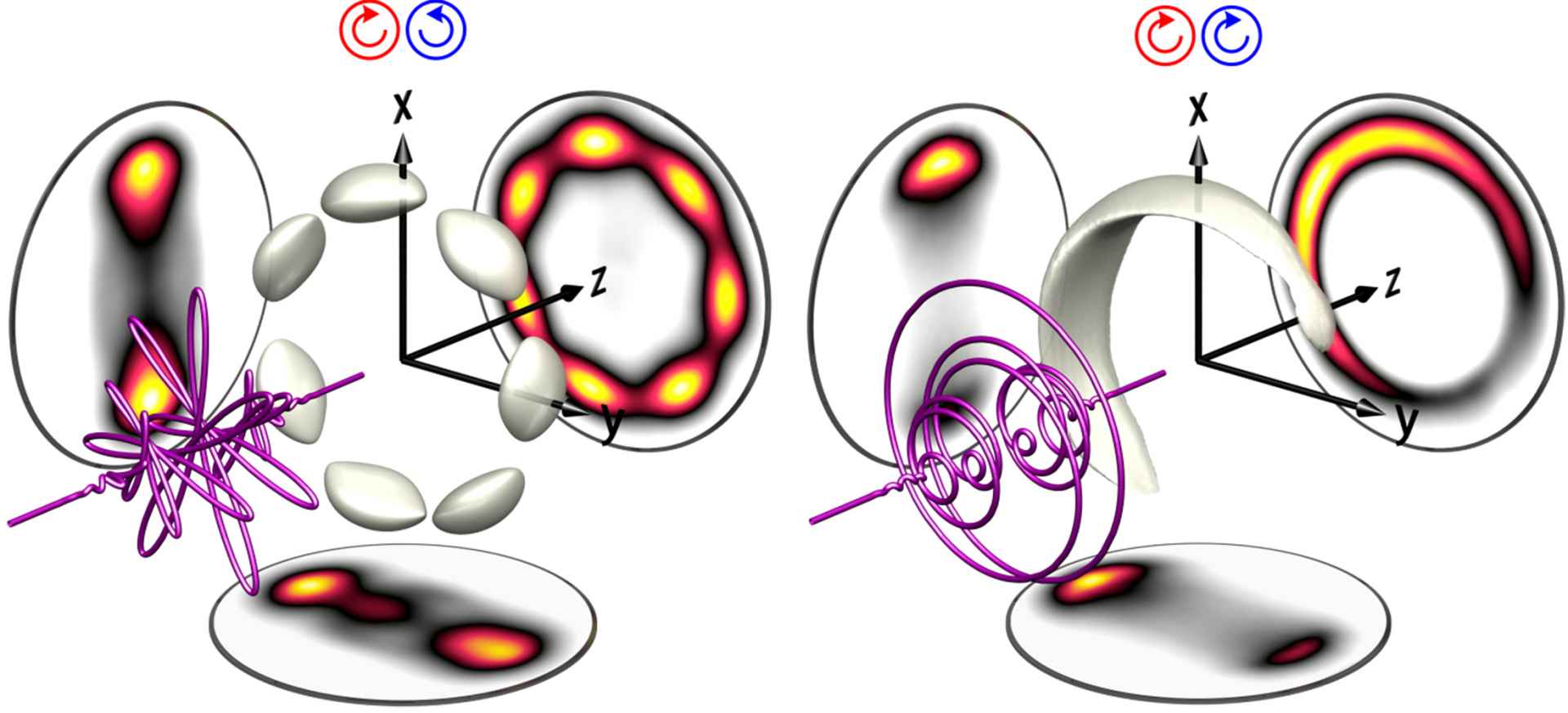 Den Forschern ist es nun erstmals gelungen, diese ungewöhnlichen Symmetrieeigenschaften der Laserpulse gezielt auf Elektronenwellen zu übertragen. Dafür bestrahlten sie ein Ensemble von Natrium-Atomen mit speziell eingestellten Laserfeldern. Natrium-Atome sind dank ihres Aufbaus für solche Experimente besonders geeignet, denn sie besitzen nur ein einziges Elektron in ihrer äußeren Hülle. „Die Ergebnisse offenbaren ein überraschendes Wechselspiel zwischen den Symmetrien des Laserfeldes und den beobachteten Eigenschaften der Elektronenwellen“, sagt Stefanie Kerbstadt, die ebenfalls an der Arbeit beteiligt war. Neben der siebenzähligen Symmetrie der Elektronen konnten die Physiker dabei die Photoelektronen auch halbmondförmig lokalisieren oder zu einem Wirbel formen.