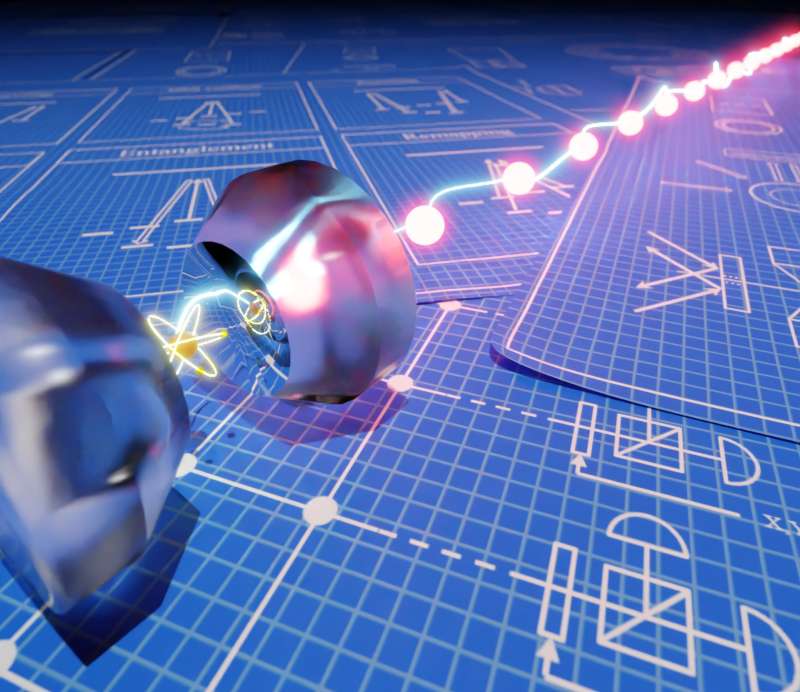 „Diesen Vorgang wiederholten wir mehrmals und auf eine zuvor festgelegte Weise“, berichtet Thomas. Dazwischen wurde das Atom jeweils auf eine bestimmte Art manipuliert – im Fachjargon: rotiert. So gelang es, eine Kette von bis zu 14 Lichtteilchen zu erzeugen, die durch die atomaren Rotationen miteinander verschränkt und in einen gewünschten Zustand gebracht waren. „Die darin miteinander verbundenen 14 Lichtteilchen sind nach unserem Wissen die größte Zahl an verschränkten Photonen, die bislang im Labor erzeugt wurde“, betont Thomas.