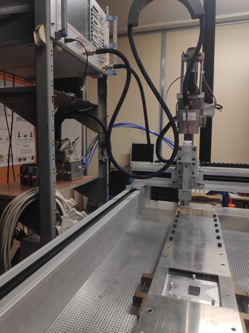 Experiment an der Université Côte d’Azur (Nizza). Ein Signal wird in den Wellenleiter injiziert, im Vordergrund sieht man weiße Zylinder, an denen die Welle gestreut wird. Ein komplexes Wellenfeld entsteht, dessen Informationsfluss analysiert wird.