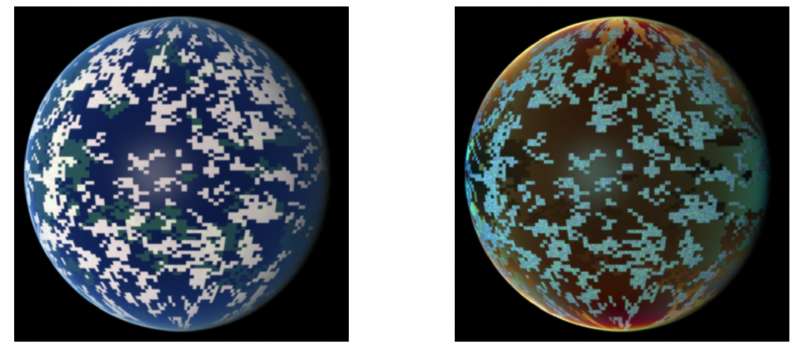 Simulierte Ansichten eines erdähnlichen Planeten außerhalb unseres Sonnensystems mit Wolken, Landmassen und Ozeanen. Links ist das „normale“ Bild des Planeten zu sehen, rechts das Ergebnis des neuen Kieler Simulationsverfahrens. Es bezieht auch die Polarisation der Planetenstrahlung mit ein und enthält so noch weitere Informationen über dessen Beschaffenheit.