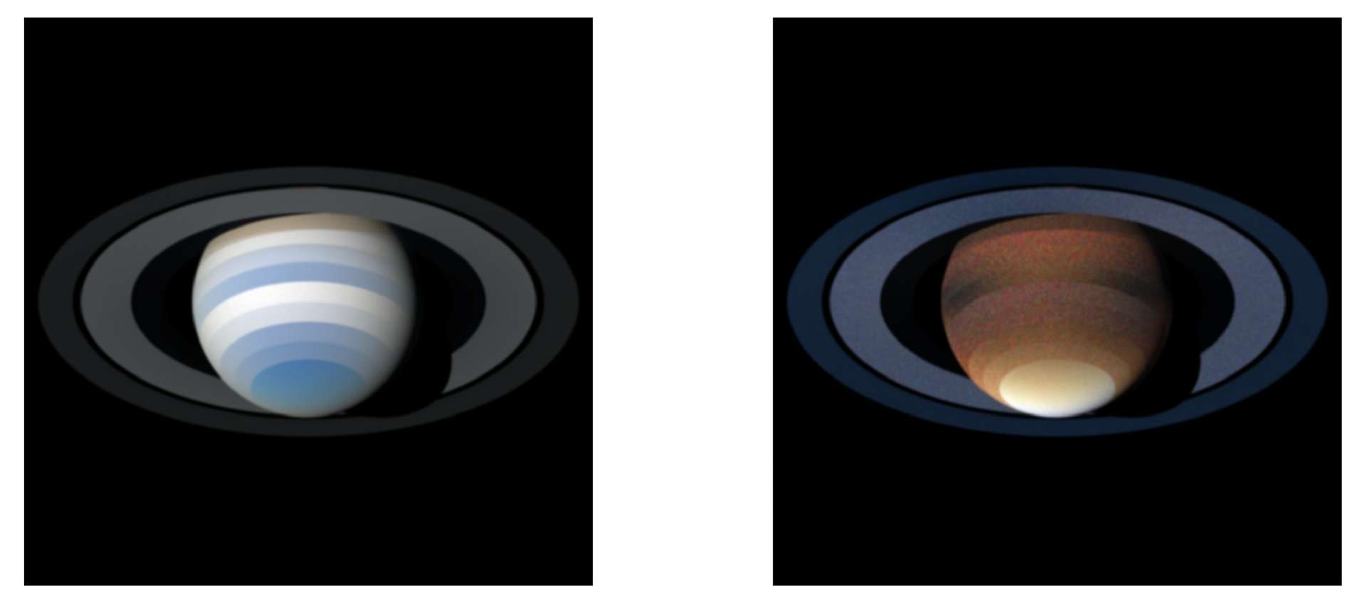 Simulierte Ansichten eines Gasriesen mit Wolkenbändern und einem Ringsystem. Links ist das „normale“ Bild des Planeten zu sehen, während rechts der Planet im polarisierten Licht gezeigt ist.