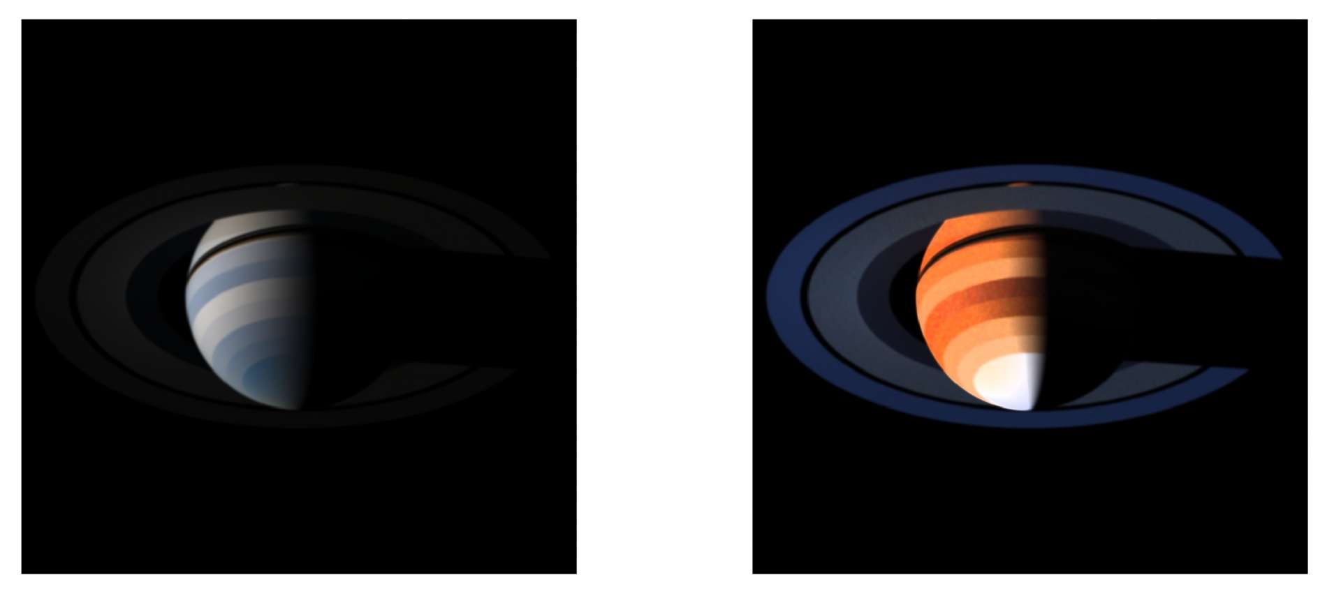 Wird der Gasriese eher von der Seite beleuchtet, ist das Ringsystem nur schwach zu erkennen. Ganz anders erscheinen der so beschienene Ring und Planet im polarisierten Licht rechts. Die verschiedenen Erscheinungsbilder des Planeten bei unterschiedlichen Beleuchtungsverhältnissen erlauben Rückschlüsse auf die physikalischen und chemischen Eigenschaften seiner Atmosphäre und des Rings.