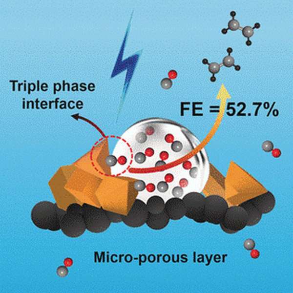 Durch eine Optimierung der Struktur der eingesetzten Gasdiffusionselektrode konnten die Forscher jetzt einen Faradayschen Wirkungsgrad (Übertragungseffizienz der Ladung für diese Reaktion) von beispiellosen 52,7% erreichen und die „magische“ 30%-Grenze für die C2-Selektivität knacken. Eine CO2-Emission tritt nicht auf. Weg zum Erfolg war eine mikroporöse Schicht aus Kohlenstofffasern mit optimal eingestellter Hydrophobizität als Träger für katalytisch aktive Kupfer-Partikel sowie eine optimierte Kaliumhydroxid-Konzentration der wässrigen Phase. Dies erhöht die CO-Konzentration an der Elektrode und verstärkt die Kupplung zwischen den Kohlenstoffatomen. Die auftretenden Nebenprodukte Ethanol, n-Propanol und Essigsäure, sind flüssig, sodass sich das gasförmige Ethylen leicht abtrennen lässt.