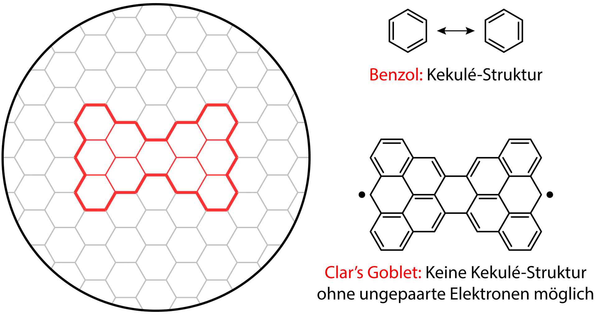 In Graphen sind die Kohlenstoffatome wie in einem Bienenwabengitter angeordnet. Jedes Kohlenstoffatom geht dabei mit seinen drei Nachbarn entweder Einfach- oder Doppelbindungen ein. Bei einer Einfachbindung verbinden sich ein Elektron von jedem Atom – ein sogenanntes Valenzelektron – mit dem Nachbarn, bei einer Doppelbindung jeweils zwei. Die Darstellung organischer Verbindungen mittels alternierender Einzel- und Doppelbindungen ist als Kekulé-Struktur bekannt. Sie ist nach dem deutschen Chemiker August Kekulé benannt, der diese Darstellung im Jahr 1865 zuerst für die einfachste organische Verbindung, Benzol, vorschlug (Bild 1). Aus dem quantenmechanischen Ausschlussprinzip von Wolfgang Pauli folgt dabei, dass sich die Elektronenpaare im gleichen Orbital jeweils in ihrer Drehrichtung – dem sogenannten Spin – unterscheiden müssen.