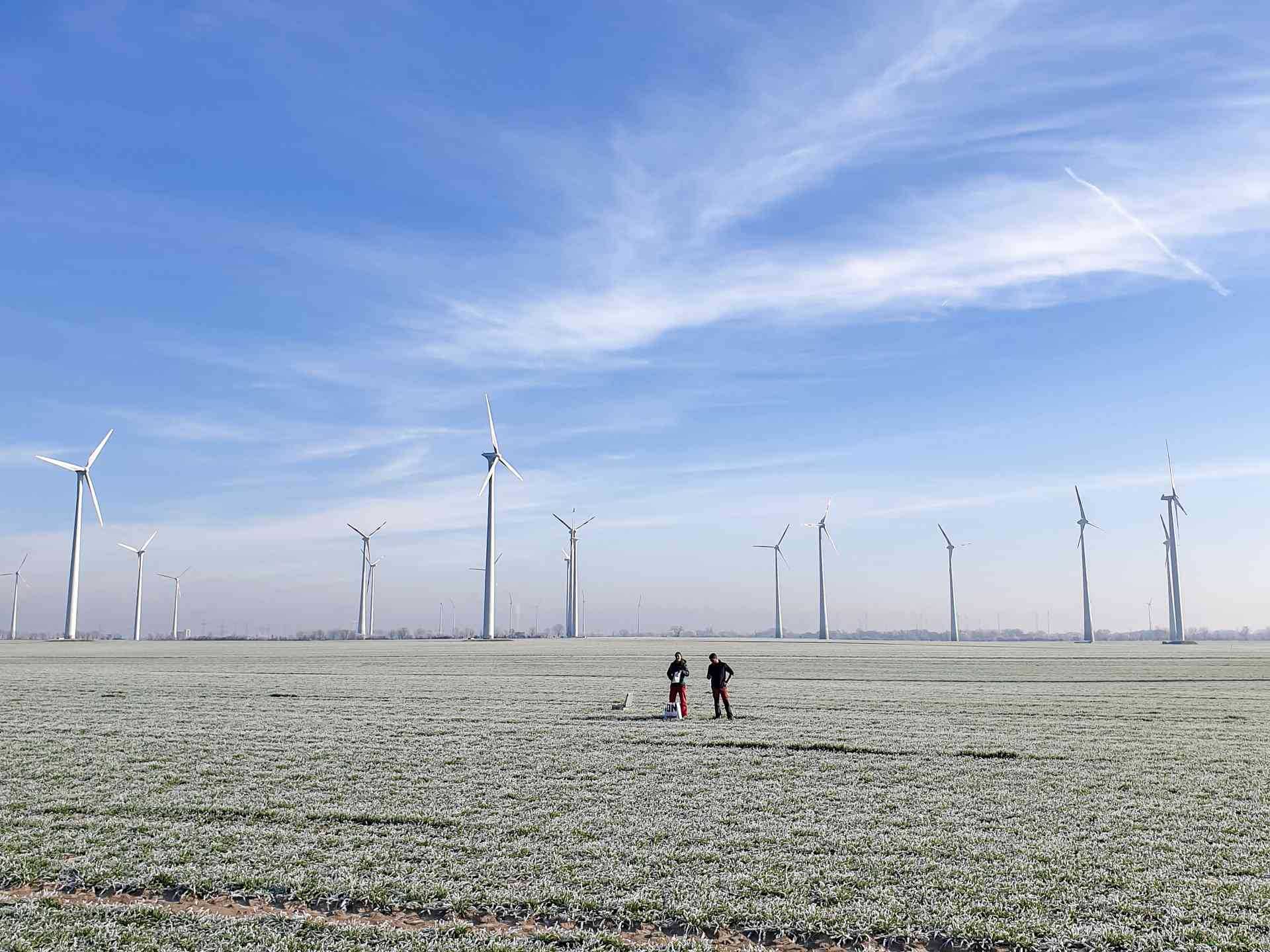 Als erste Annäherung an eine städtische Gebäudestruktur haben Forschende um Marco Pilz und Fabrice Cotton vom Deutschen GeoForschungsZentrum GFZ in Potsdam nun Windkraftanlagen, die in einem Windpark regelmäßig angeordnet sind, untersucht. Gemeinsam mit Kolleginnen und Kollegen aus Forschungseinrichtungen in Grenoble und Toulouse (Frankreich), von der Universität Potsdam und der Ludwigs-Maximilians-Universität München haben sie im Februar 2023 Messungen in einem Windpark bei Nauen westlich von Berlin durchgeführt. Auf einer Fläche von 1,5 mal 2,5 Quadratkilometern installierten sie ein Netzwerk aus rund 400 Geophonen, die die Bodenschwingungen aufzeichneten. Dabei wurden keine expliziten Erdbebenwellen betrachtet oder künstlich erzeugt, sondern die natürlichen Bodenschwingungen, die sich im selben Frequenzbereich bewegen. Ergänzt wurde das Methodenspektrum durch weitere geophysikalische Instrumente wie optische Fasern, mit denen verschiedene Welleneigenschaften gemessen werden können, sowie Rotations- und Barometersensoren, und durch ein numerisches Modell der einzelnen Windkraftanlagen.