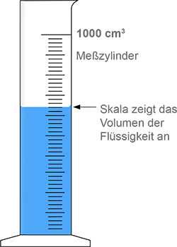 Ein Volumen von etwa einem Liter kann mit einem Messzylinder bestimmt werden. Wenn die Flüssigkeit in den Zylinder gegossen wird, zeigt die Höhe des Wasserspiegels auf der Skala das Volumen an.