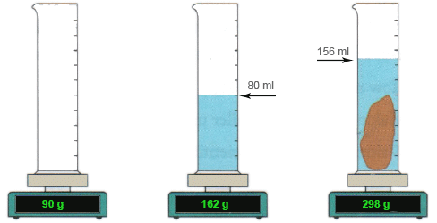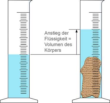 Wenn die Form eines Festkörpers zu ungünstig ist, um das Volumen zu berechnen, kann er in einen teilweise mit Wasser gefüllten Messzylinder abgesenkt werden, wie unten gezeigt. Der Anstieg des Pegels auf der Volumenskala ergibt sein Volumen. Angenommen der Festkörper schwimmt, dann kann man daran ein Metallstück befestigen, das ihn unter Wasser zieht. Dann wird das Gesamtvolumen bestimmt. Das Volumen des Metalls wird in einem separaten Experiment gemessen und dann von dem Volumen des ersten Experiments subtrahiert.