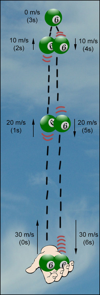 Da die Aufwärtsgeschwindigkeit mit 30 $\mathsf {\tfrac {m}{s}}$ genau so groß ist wie die Abwärtsgeschwindigkeit mit -30 $\mathsf {\tfrac {m}{s}}$, kann die Bewegung der Kugel wie folgt beschrieben werden: