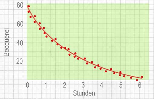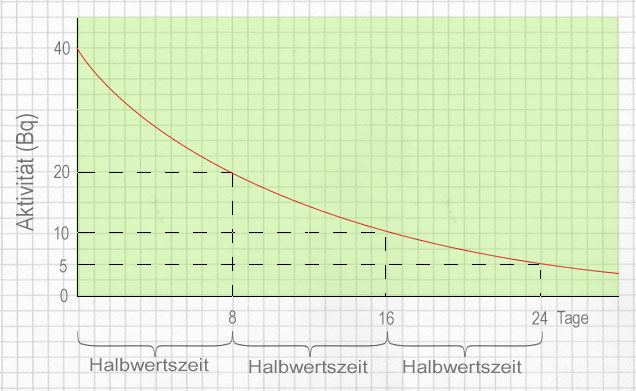 Die Grafik weiter unten zeigt, wie sich die Aktivität einer Iod-131-Probe im Durchschnitt mit der Zeit ändert. Da die Aktivität immer proportional zur Anzahl der noch nicht zerfallenen Atomkerne ist, halbiert auch sie sich alle 8 Tage. Die Halbwertszeit hat also noch eine andere Bedeutung: