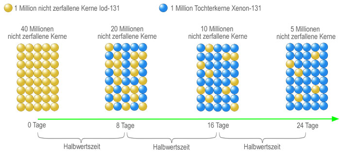 Zu Beginn gibt es 40 Millionen nicht zerfallene Atomkerne. 8 Tage später ist die Hälfte der Iod-131 Kerne zu Xenon-131 zefallen. Mit der Halbierung der Anzahl der nicht zerfallenen Atomkerne halbiert sich auch die Anzahl der Unterteilungen in den nächsten 8 Tagen. Die Menge halbiert sich in den nächsten 8 Tagen wieder ... und so weiter. Iod-131 hat also eine Halbwertszeit von 8 Tagen.